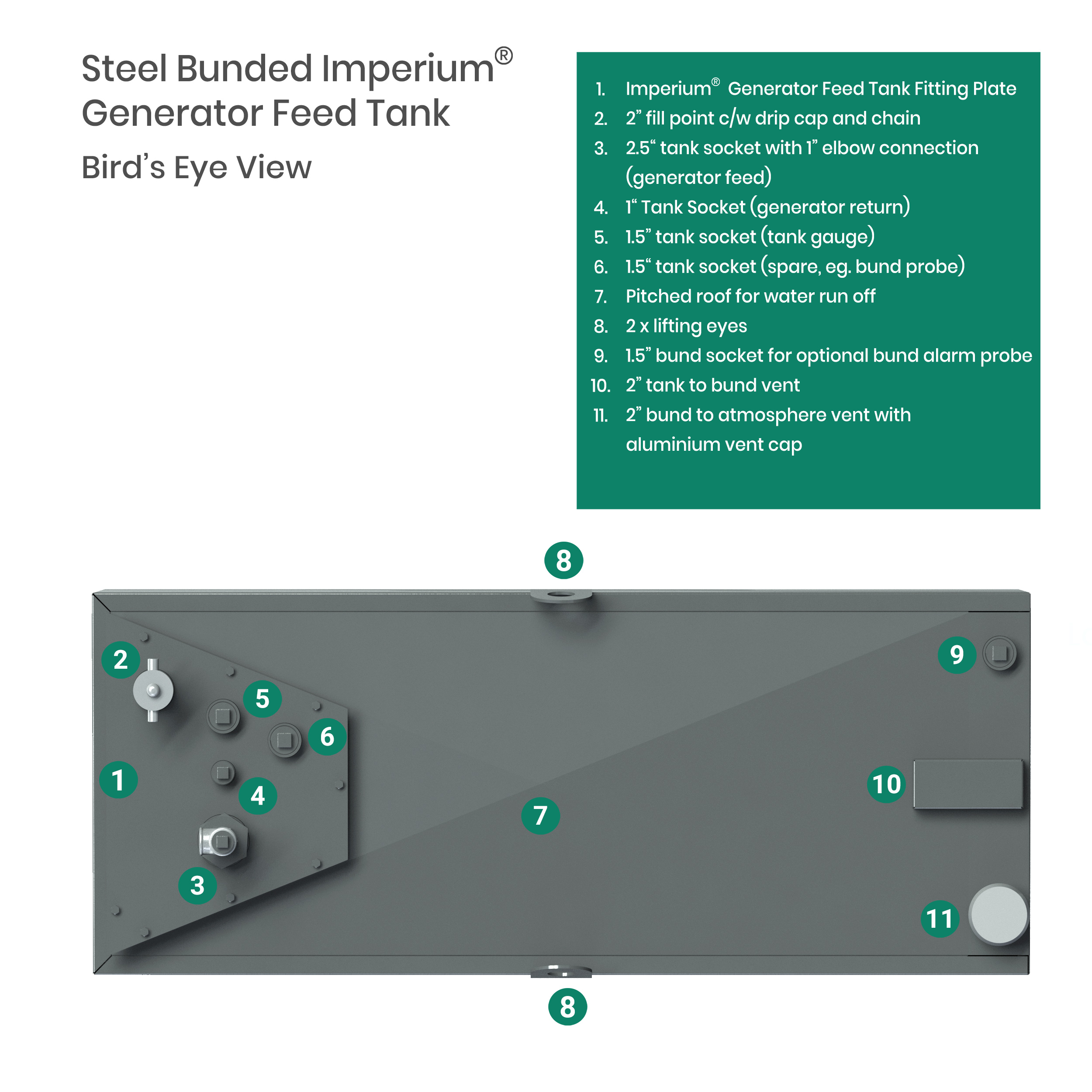 Integration & future ready – Designed to work seamlessly with gauges, alarms, hoses and control systems, and compatible with diesel, gas oil and HVO. The interchangeable Imperium® fittings plate allows future changes in tank use with minimal disruption.